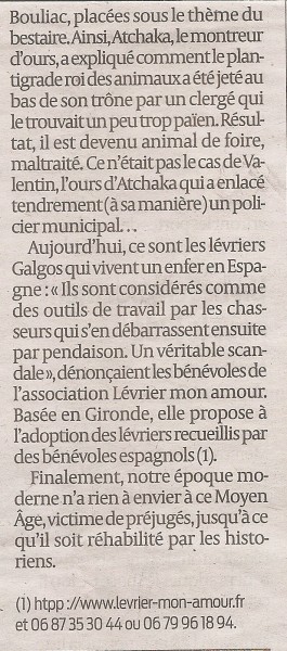 Et le succès est au rendez-vous. Après le spectacle, découverte du site laissé en libre accès pour petits et grands. Les organisateurs ont fait venir des lévriers,pour la bonne cause. L'association bordelaise Lévrier mon amour a en effet fait le déplacement tout exprès. Des chiens de chasse venus d'Espagne et promis à la pendaison dès que chutent leurs performances et qu'elle met à l'adoption en France. Un éclairage nouveau qui tranche un peu au milieu des festivités mais tend un pont entre les siècles.