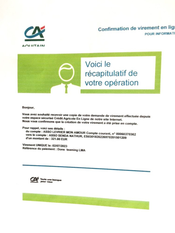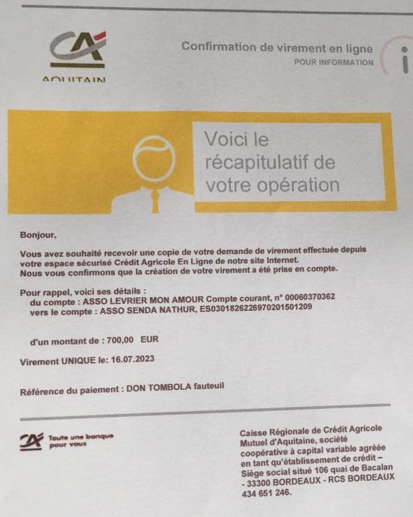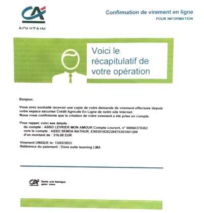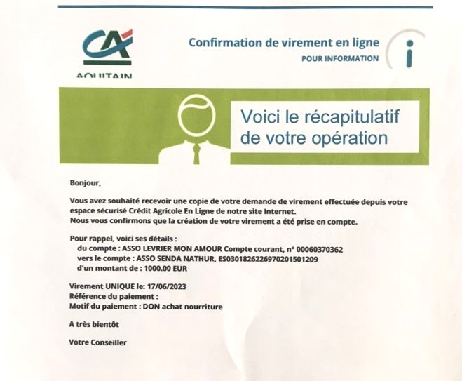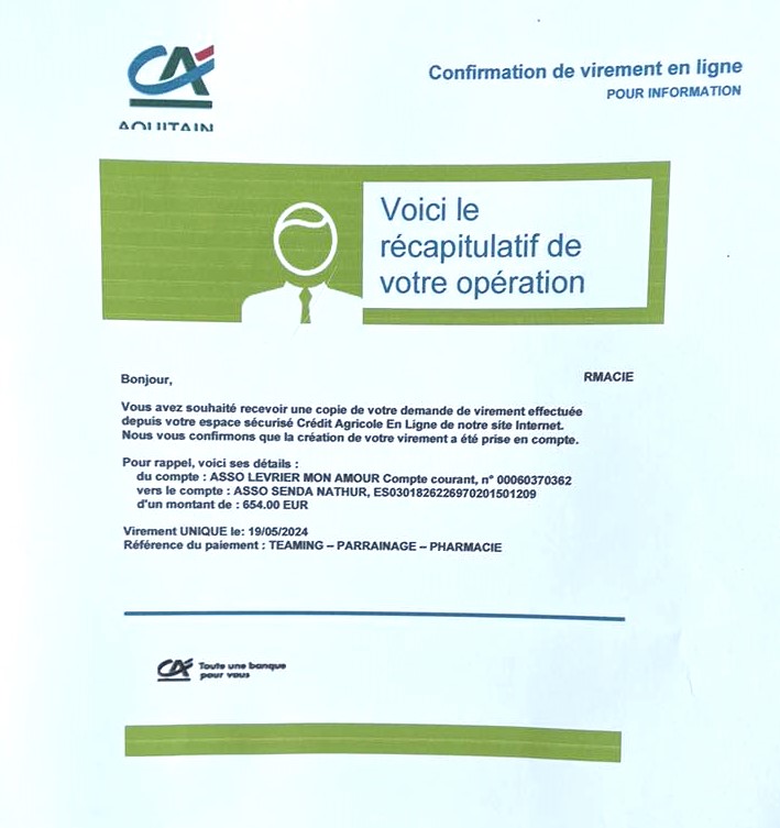 Le 4 Juin 2024, grâce à vos généreux dons notre association a pu faire 2 virements :