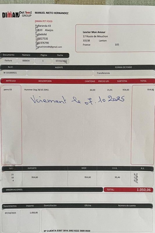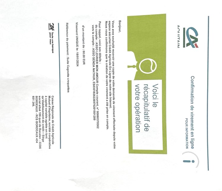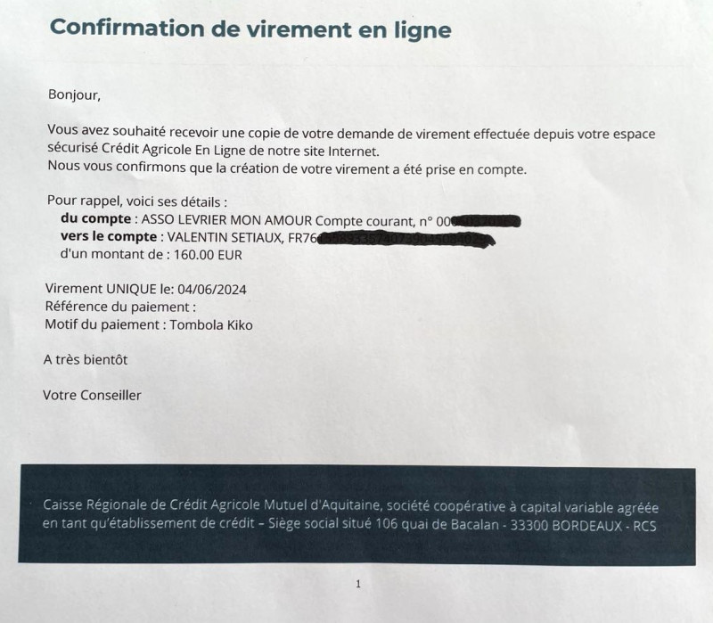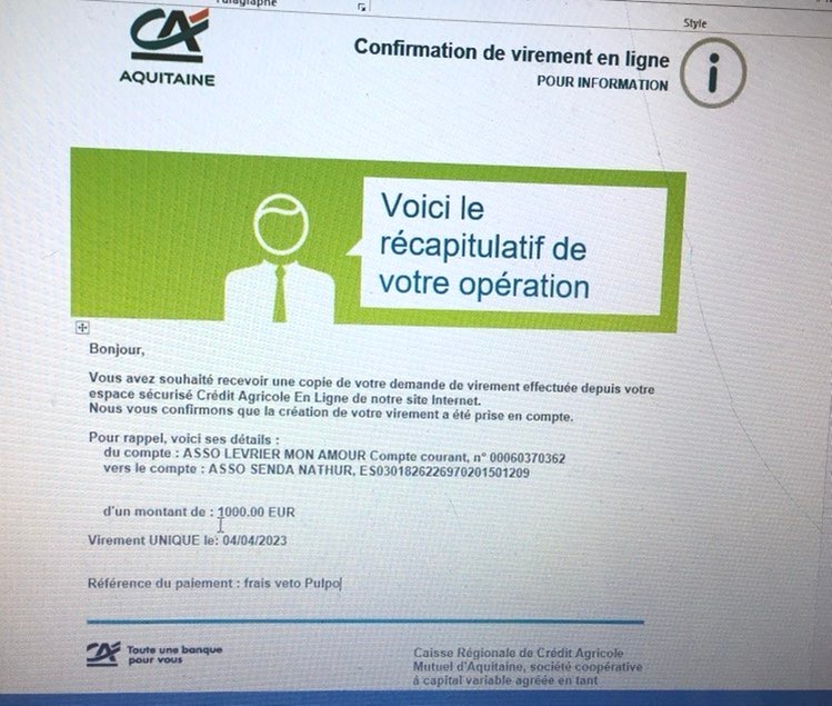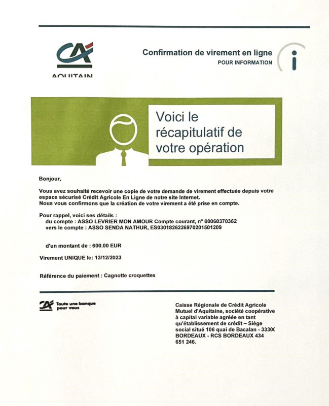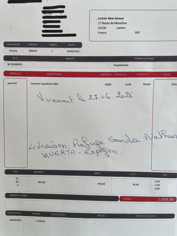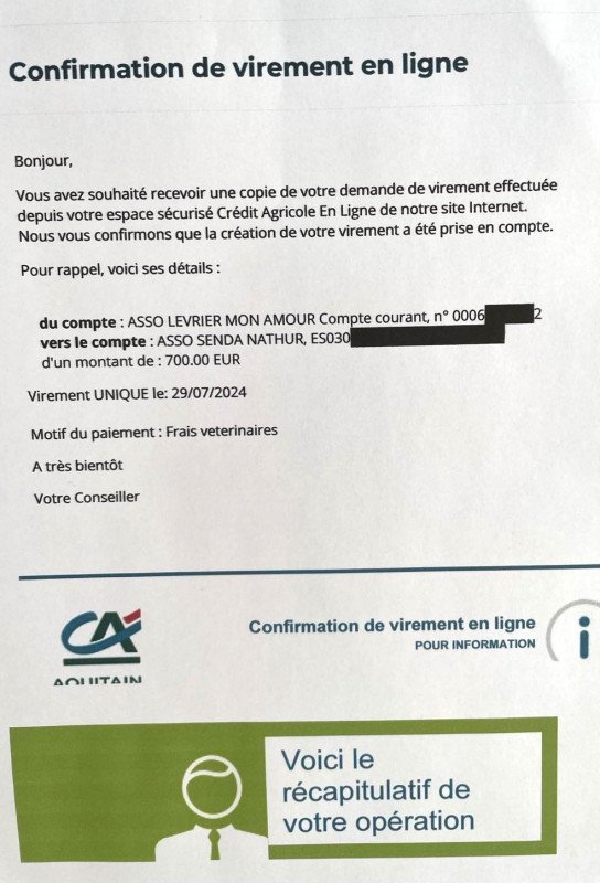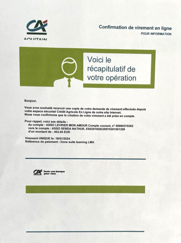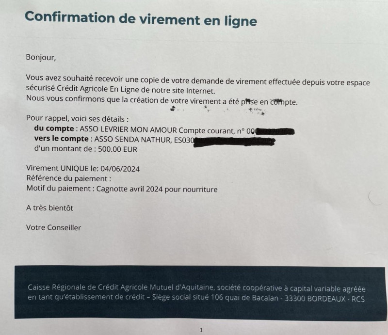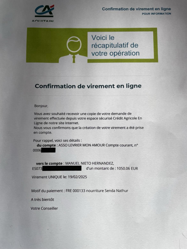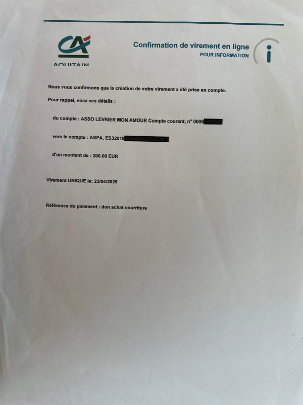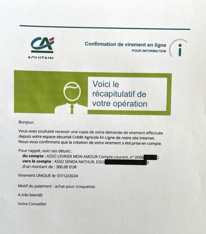 Notre association Lévrier mon Amour vient de faire un virement de 1050,06 euros concernant une livraison de 1 tonne 200 de croquettes pour le refuge Senda Nathur de Ana.