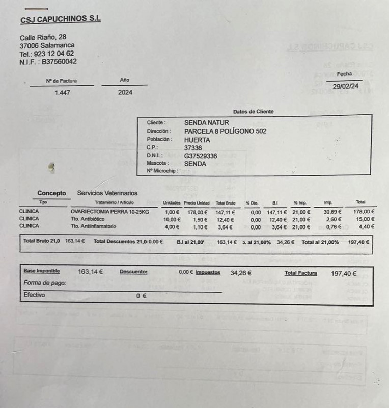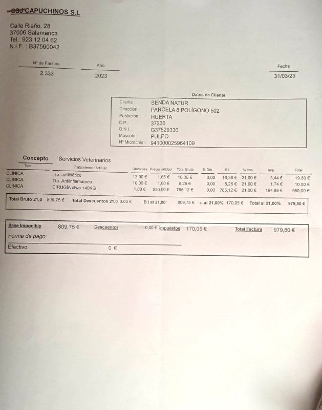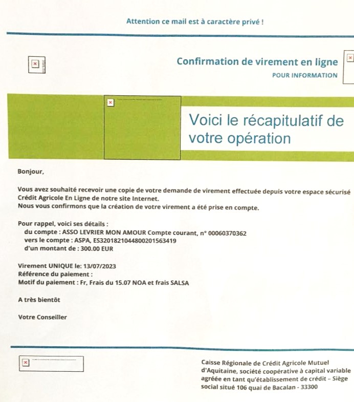 Le 13 juillet 2023, LMA a fait un virement de 300 euros pour venir en aide à Veronica (refuge A.S.P.A. à Socuellamos) suite aux frais vétérinaire de Noa et de Salsa.