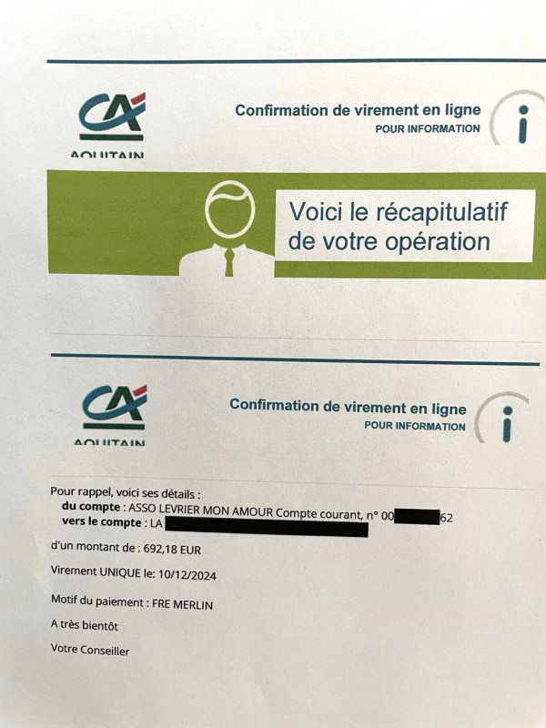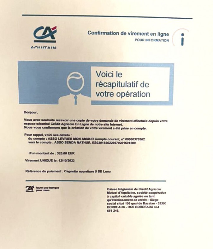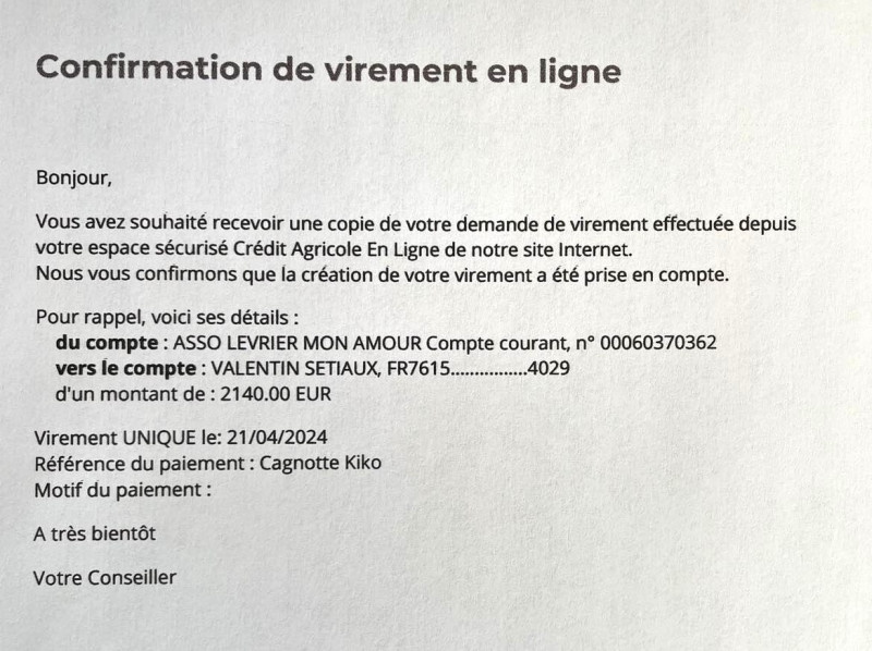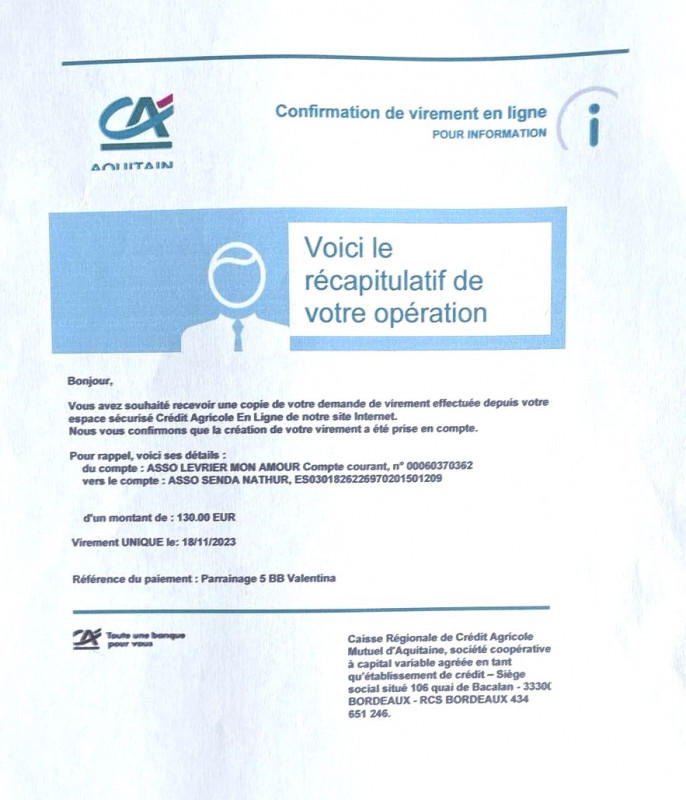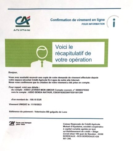 Le 18.11.2023 nous avons fait un virement de 130 euros grâce aux marraines et parrains des 5 BB galguitos ( Lucine - Gabriel - White Lord - Sherlock et Capitan) de maman Valentina.