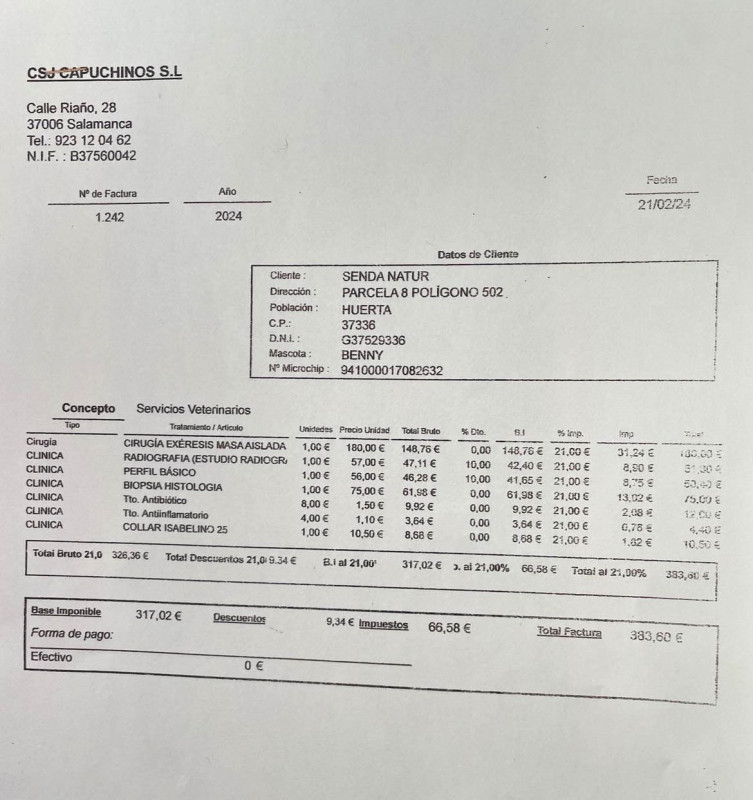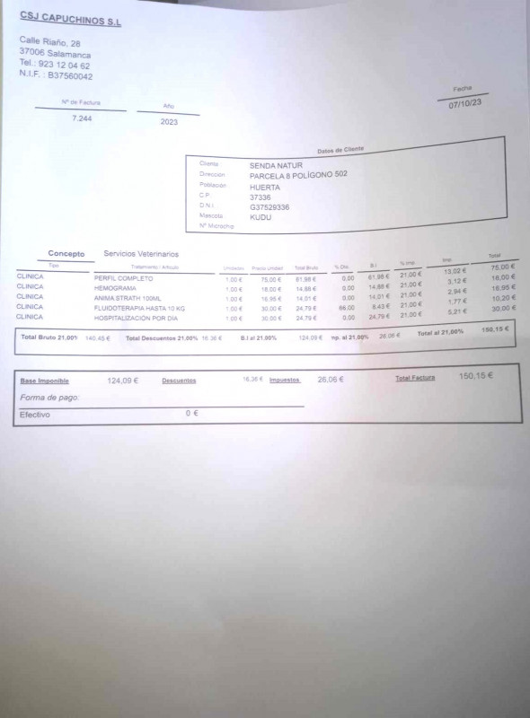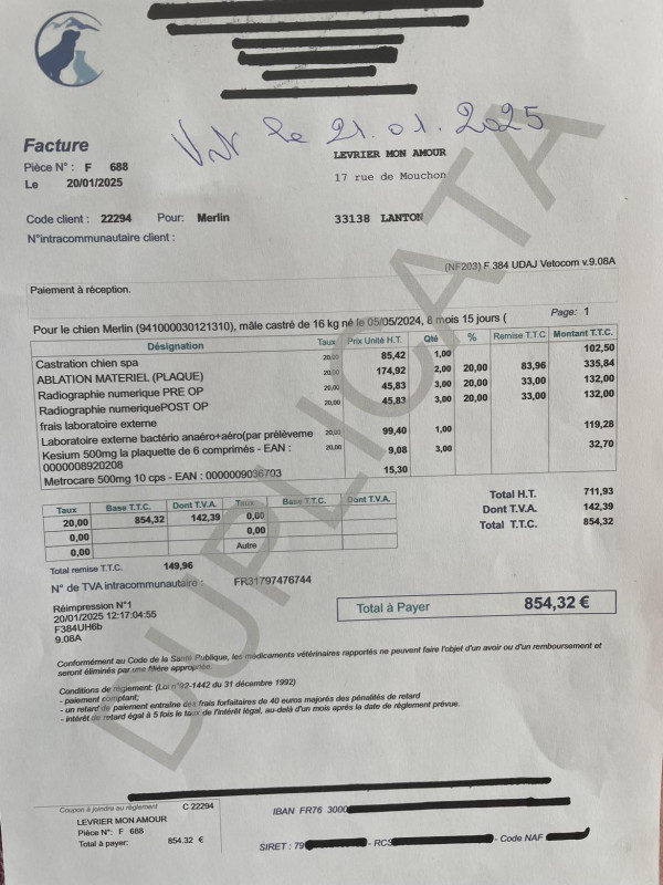 Le 11.10.2023, nous avons fait un virement de 150, 15 € à Ana de Senda Nathur en remboursement de frais vétérinaire.