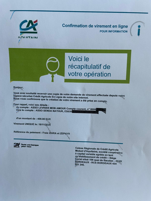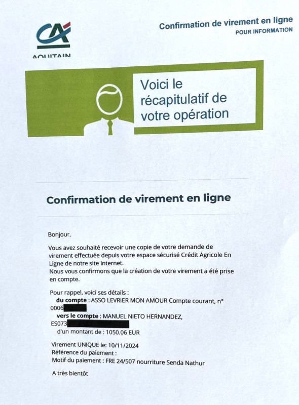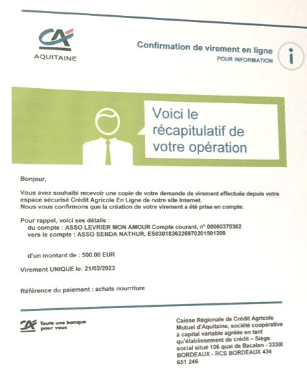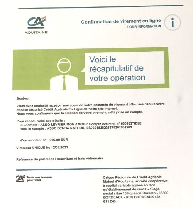 Le 12.02.2023, LMA a pu faire un virement de 600 € à Ana (Refuge Senda Nathur) pour achat de nourriture et paiement de frais vétérinaire.