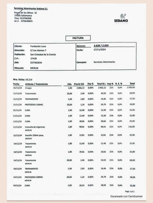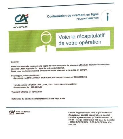 Le 12.05.2023, notre association a fait un virement bancaire de 500 € à la Fundacion Luna en participation de l'incinération individuelle et des frais vétérinaires pour la petite RIMA (décédée le 12.05.2023).