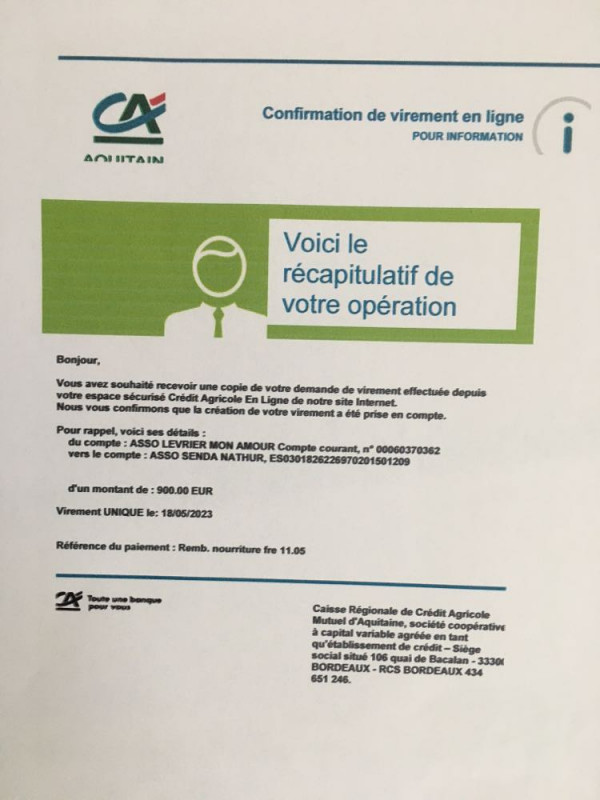 Le 18 mai 2023, notre association a fait un virement de 900 euros au refuge de Senda Nathur de Ana pour remboursement de la facture d'achats de nourriture en date du 11.05.2023.