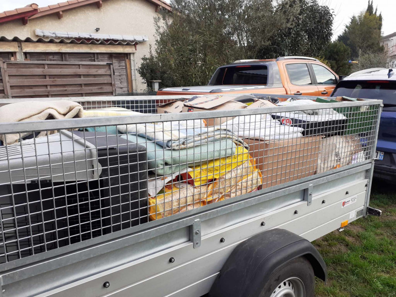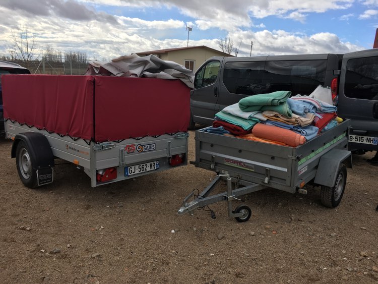 ainsi que beaucoup de couvertures, des panières plastique, des manteaux, de la pharmacie et divers matériel.
