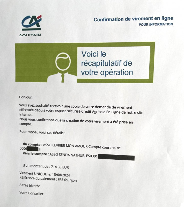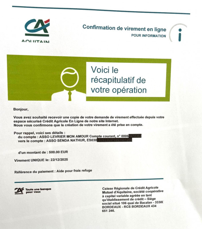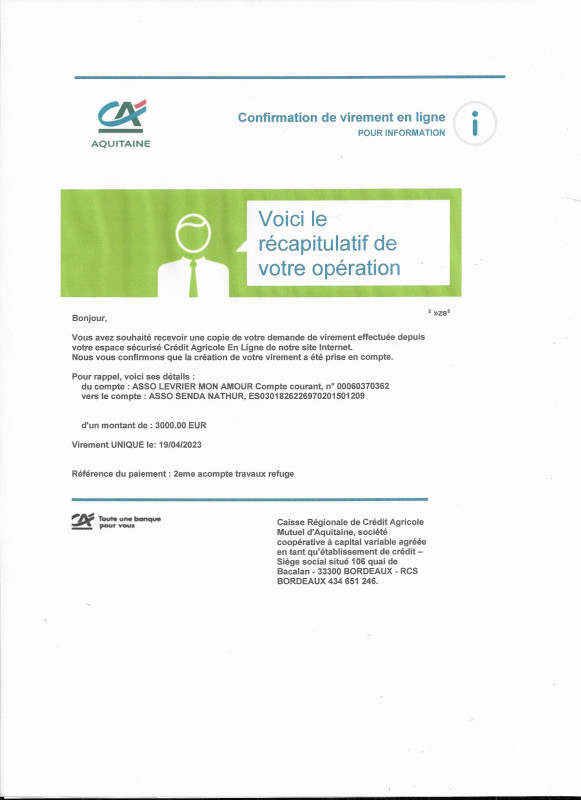 Le 4 décembre 2023, notre association Lévrier mon Amour a fait un virement de 5000 euros correspondant au 4ème acompte pour les travaux de notre refuge partenaire Senda Nathur.