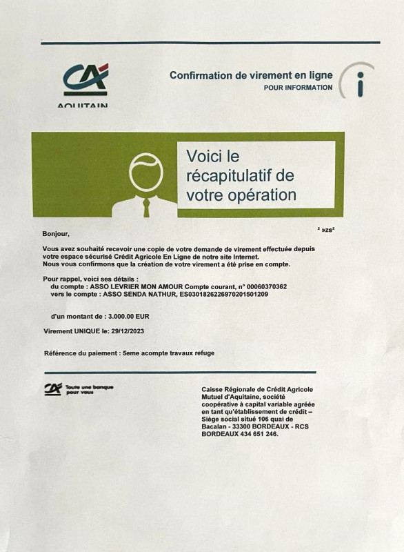 Le 8 octobre 2023, virement de 10.000 euros en 3ème acompte des travaux à Senda Nathur.