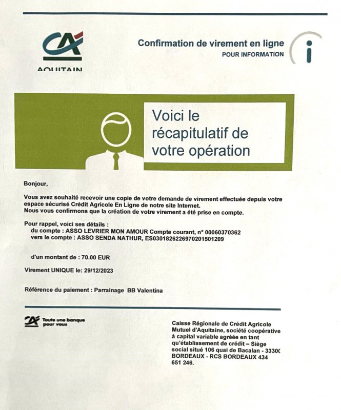 Le 29.12.2023 nous avons fait un virement de 70 euros grâce aux marraines et parrains des 5 BB galguitos de maman Valentina.