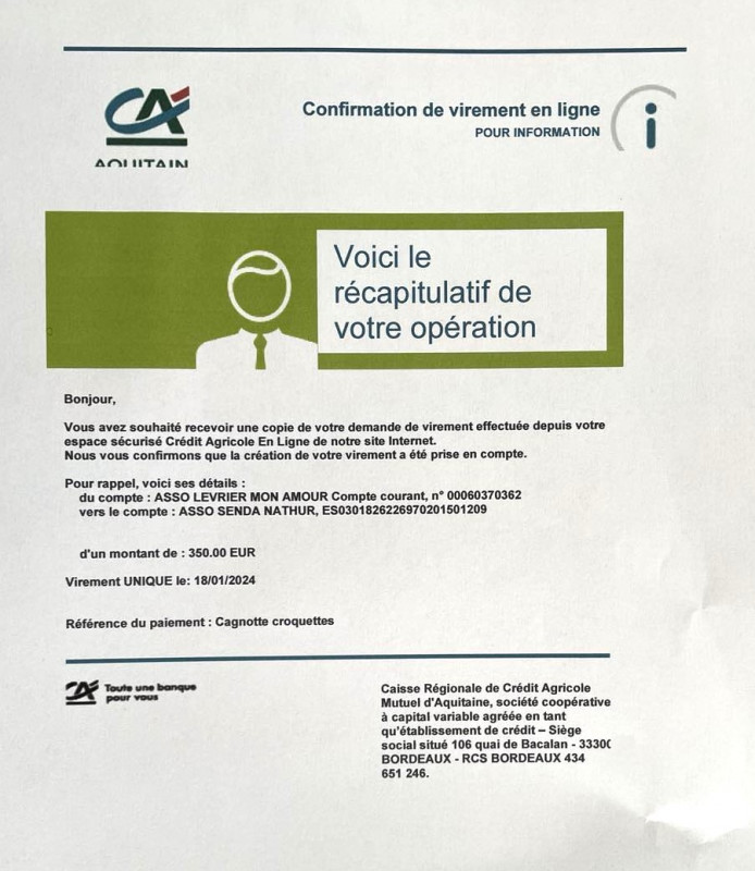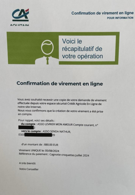 * virement de 500 euros grâce à la cagnotte croquettes mise en place par Nathalie Escallier en mai 2024.