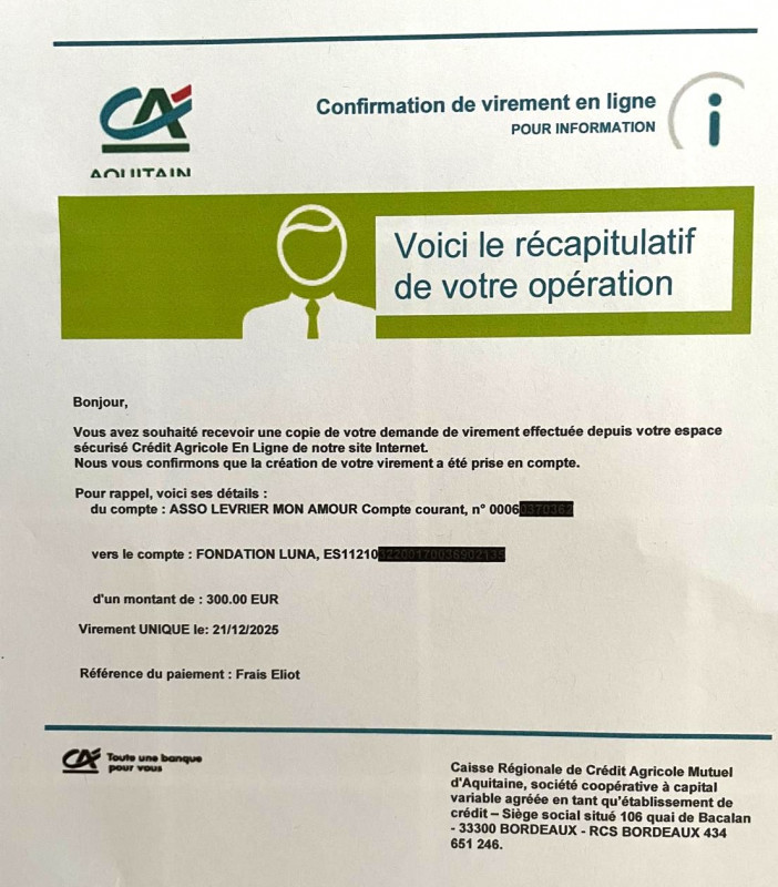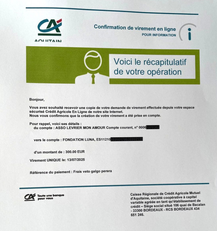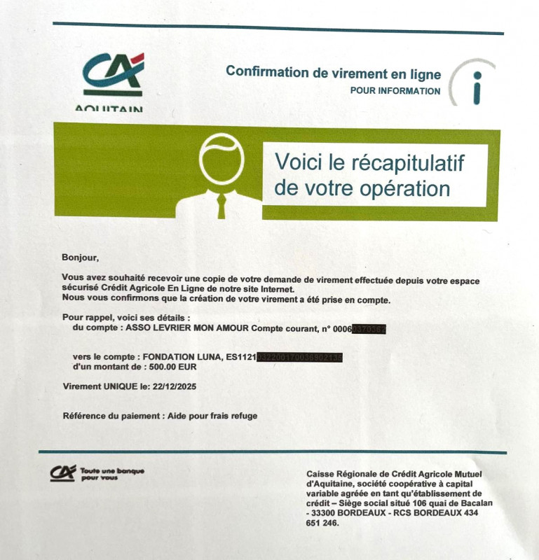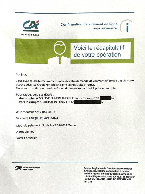 Notre association Lévrier mon Amour vient de faire un virement bancaire de 500 € à la Fundacion Luna pour l'achat de nourriture.
