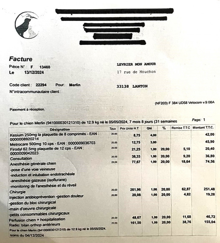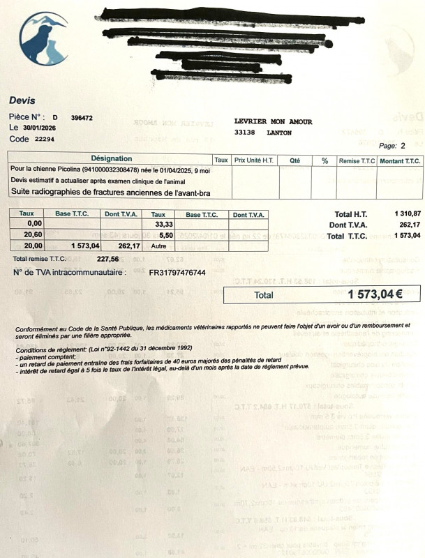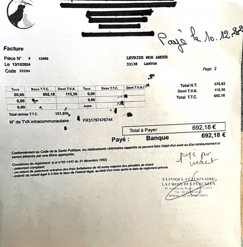 Le refuge de Ana croule sous les factures de frais vétérinaire, Lévrier mon Amour a fait un virement de 770 € pour prendre en charge une partie de ces frais.