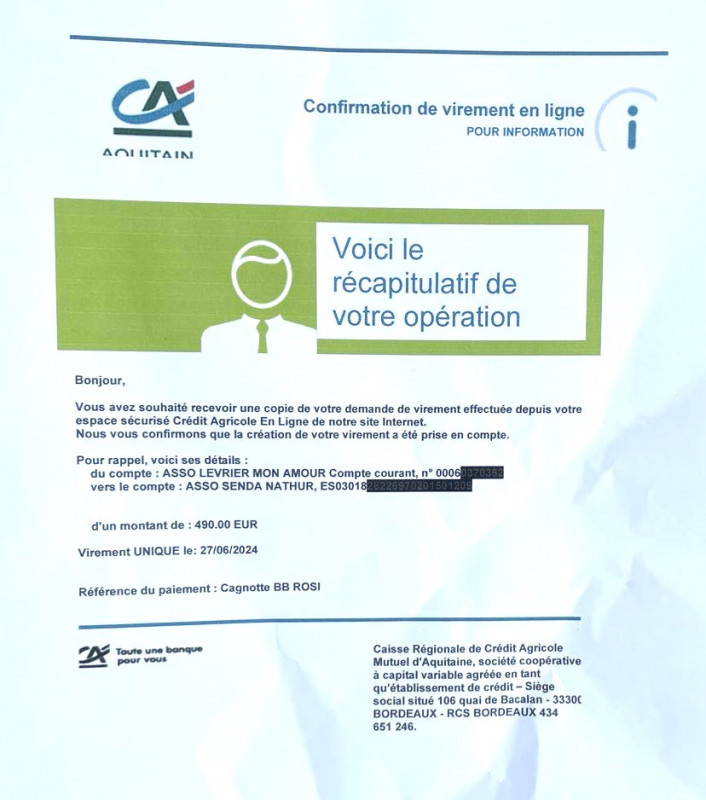 💖💖💖 Grâce à votre aide, Lévrier mon Amour vient de faire 3 virements d'un montant de 1530 € pour la prise en charge des frais vétérinaire, nourriture etc ... des 10 BB de Rosi.