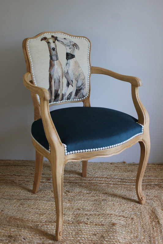 Justine la maman de notre adorable KIKO offre ce magnifique fauteuil style cabriolet entièrement restauré aux bois décapés et protégés d'un vernis satiné ; et recouvert d'un doux velours bleu et d'un jacquard avec deux élégants lévriers. Finition clous blancs crépi doré. Assise semi traditionnelle. Cette merveille sera à retirer du côté de Bordeaux."