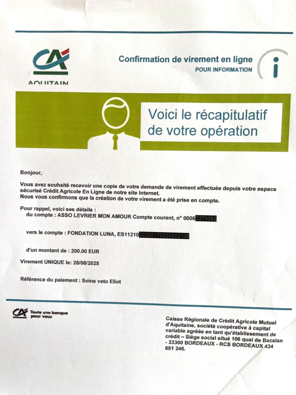 Notre association LMA vient de faire un virement de 200 euros à la Fundacion LUNA pour venir en aide aux soins de Eliot qui est en cours de traitement contre la dirofilariose.