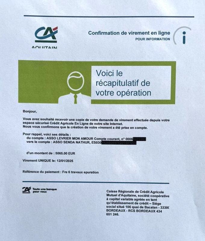 Le 12 janvier 2025 LMA a fait un virement de 5065,00 € pour venir en aide au refuge Senda Nathur de Ana suite aux travaux de la station d'épuration.
