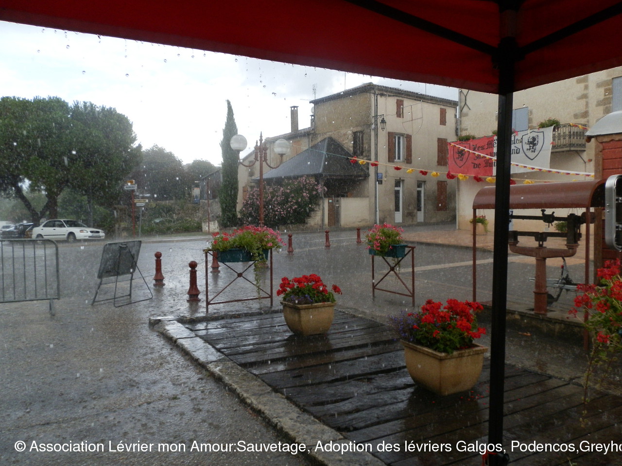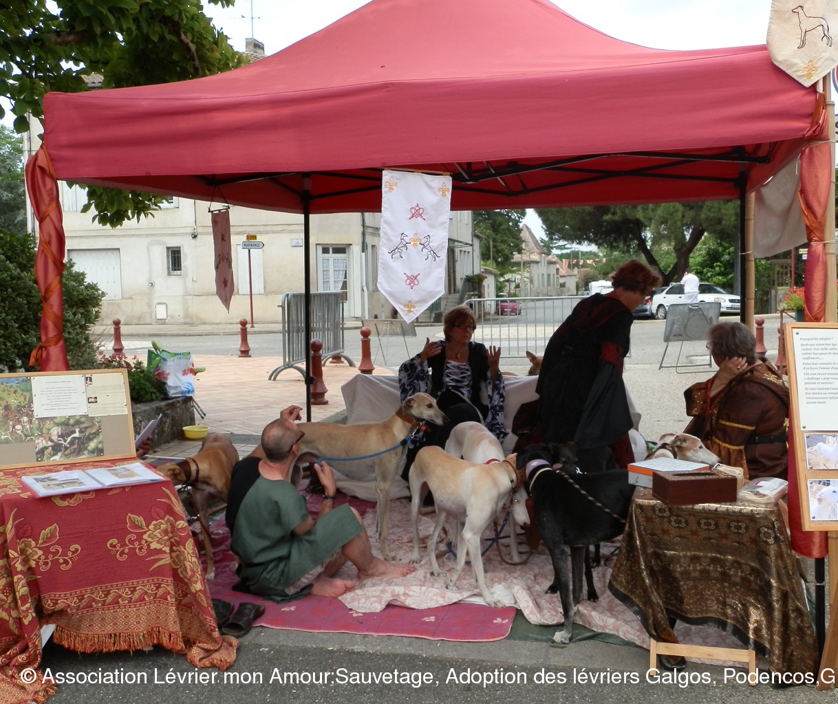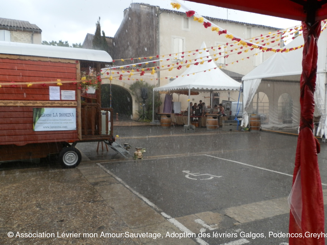 Mais le temps n'est pas avec nous.......... les quelques visiteurs présents n'oublient quand même pas de venir voir les galgos et nous ne manquons pas de raconter leur histoire, là-bas en Espagne et surtout de parler de toutes leurs qualités qui font d'eux, un compagnon incontournable...