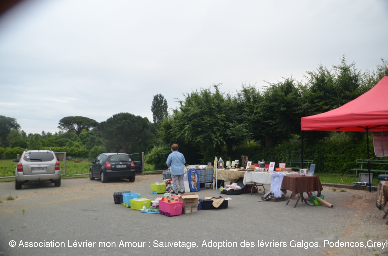 Un dimanche pluvieux du mois de juin, petit vide-grenier dans petite bourgade des côtes de Bourg au milieu des vignes, mais grand accueil de la part de Géraldine et Mady, qui nous avaient conviées à cette manifestation en faveur de nos galgos.