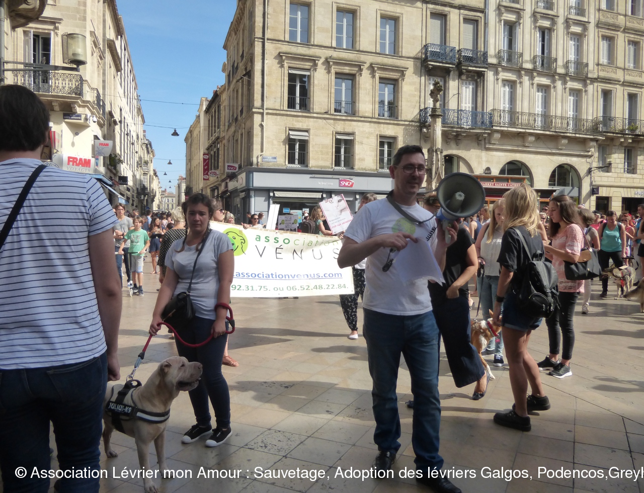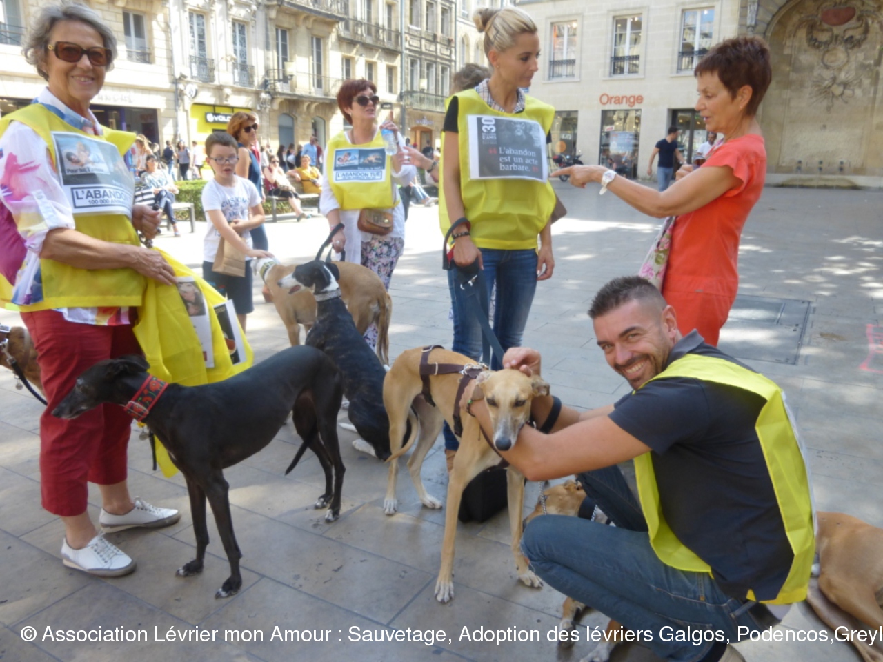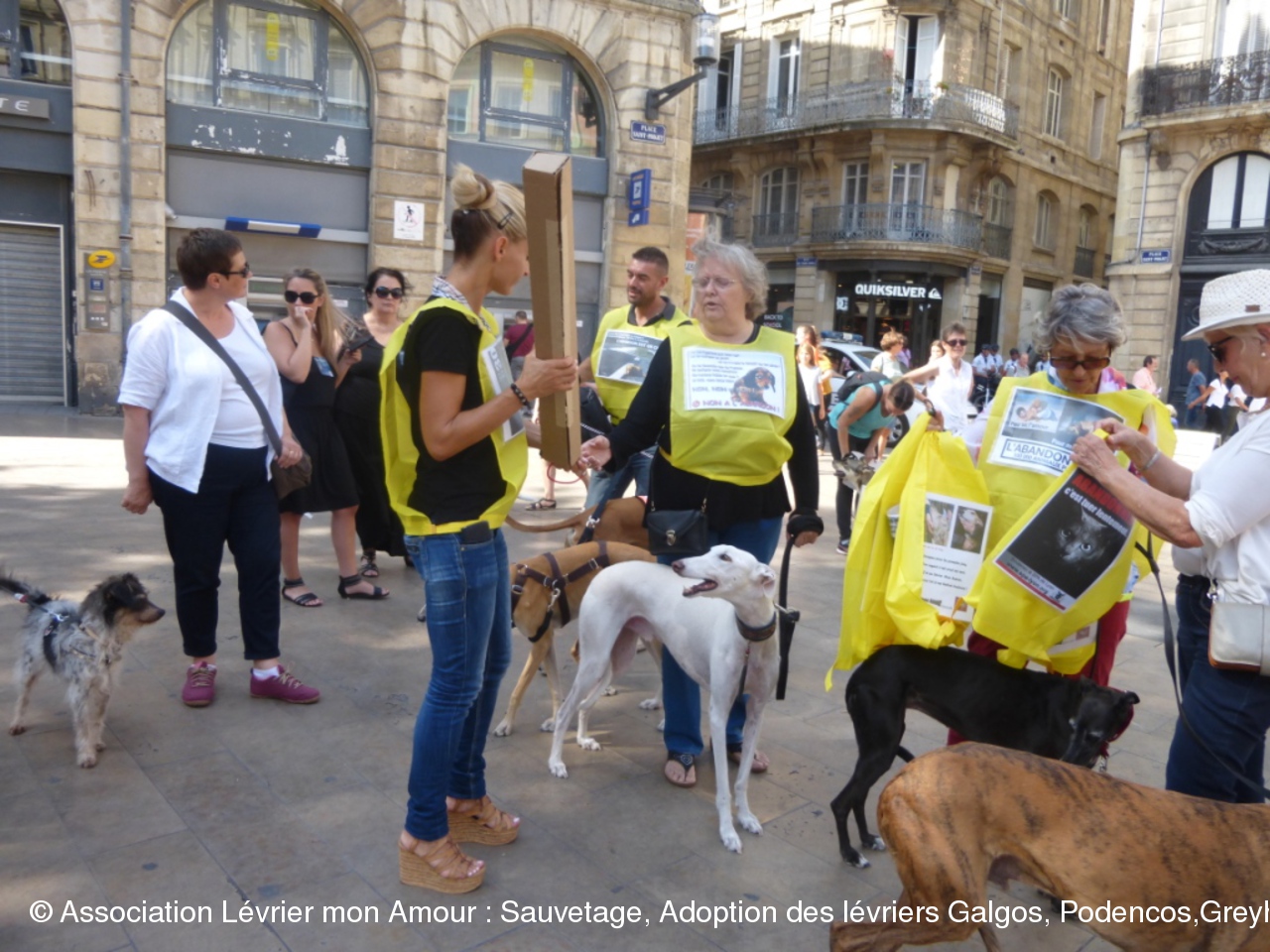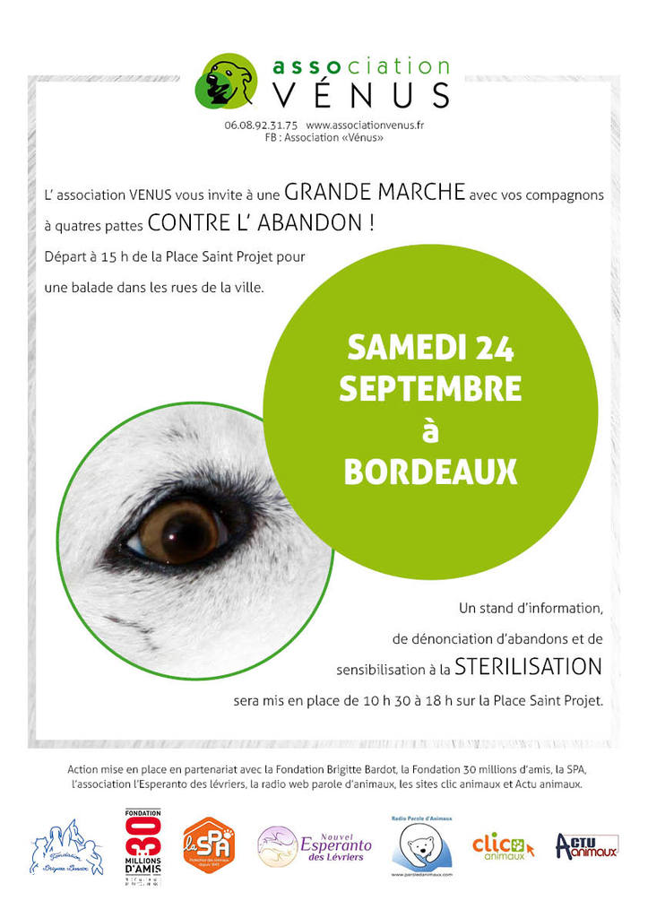 Le 24 Septembre 2016 à Bordeaux, Lévrier mon Amour a participé à la marche contre l’abandon organisée par l’association Venus. La SPA de Bordeaux (Antenne de la SPA nationale), 30 millions d’ Amis, le nouvel Esperanto des Lévrier et la fondation Brigitte Bardot était aussi présents ou représentés. Nadine n'a pas pu être présente car elle travaillait de nuit.