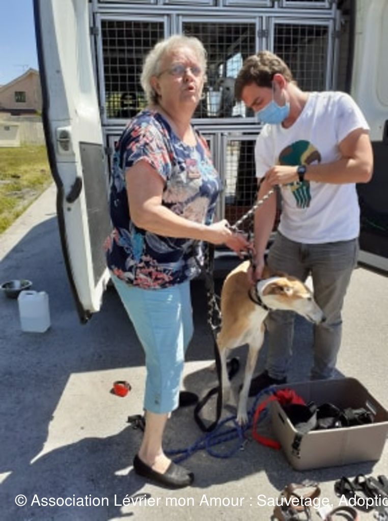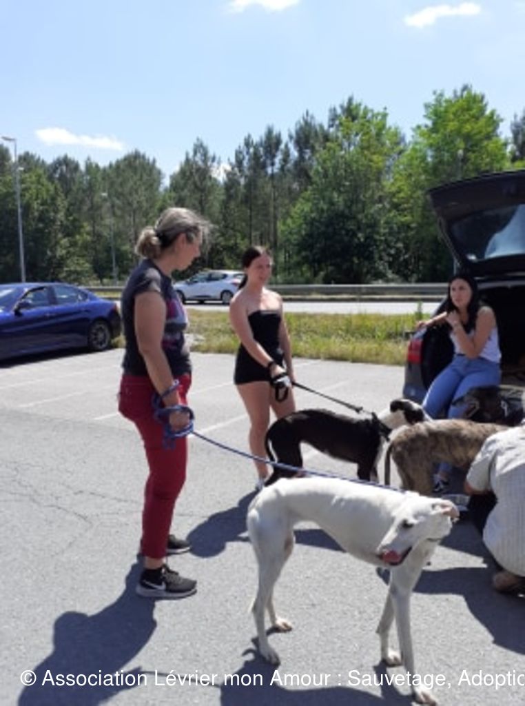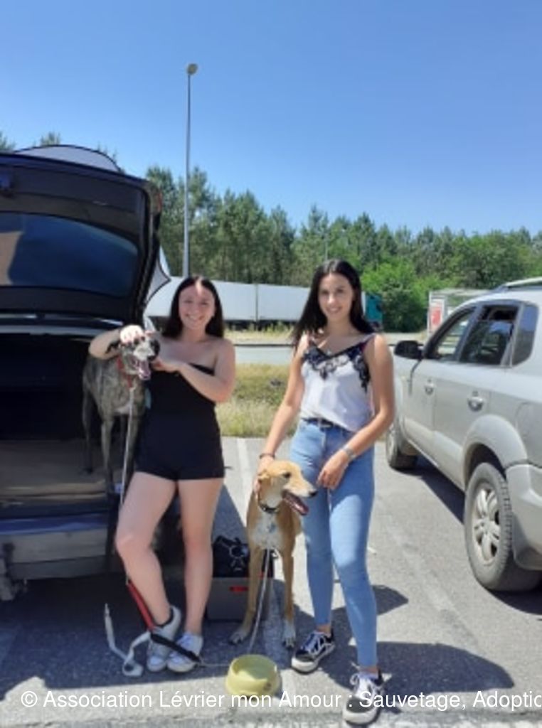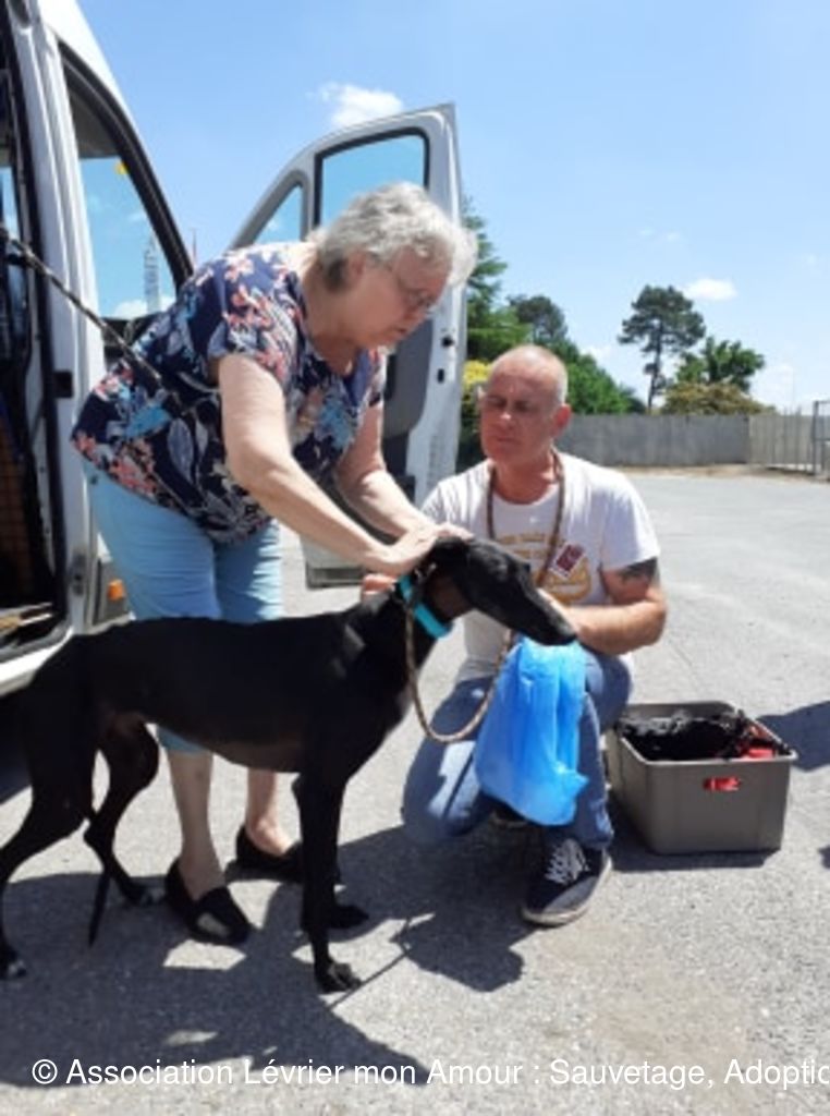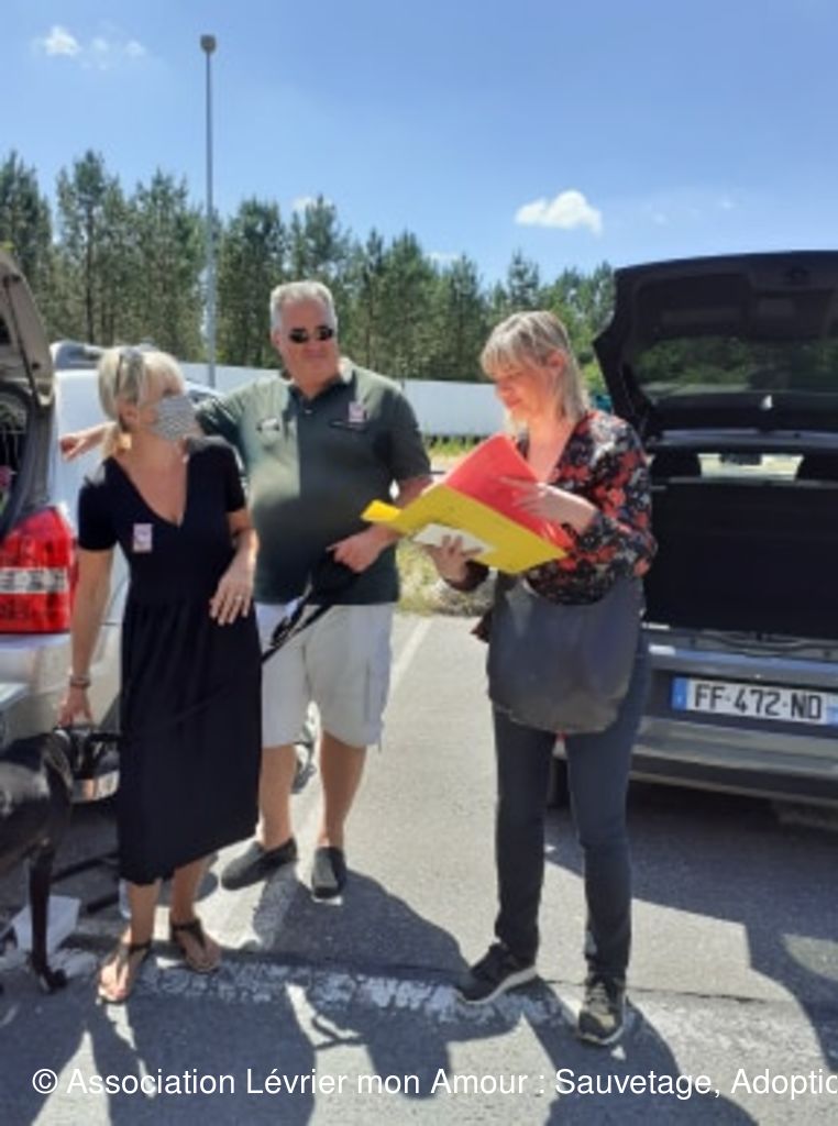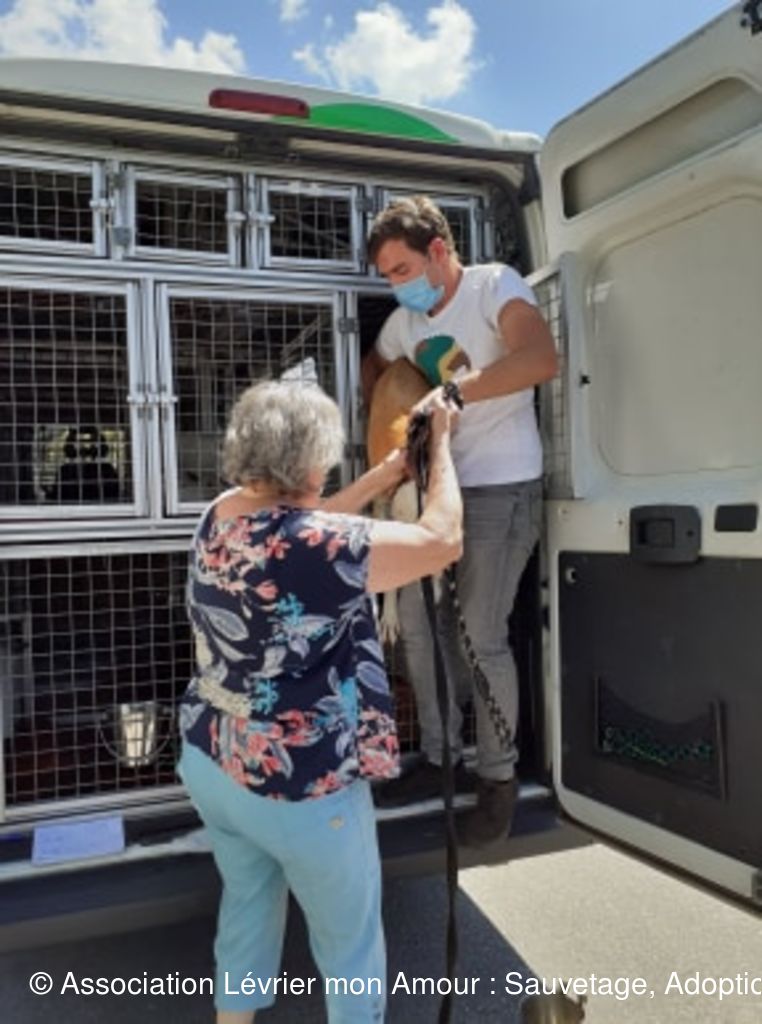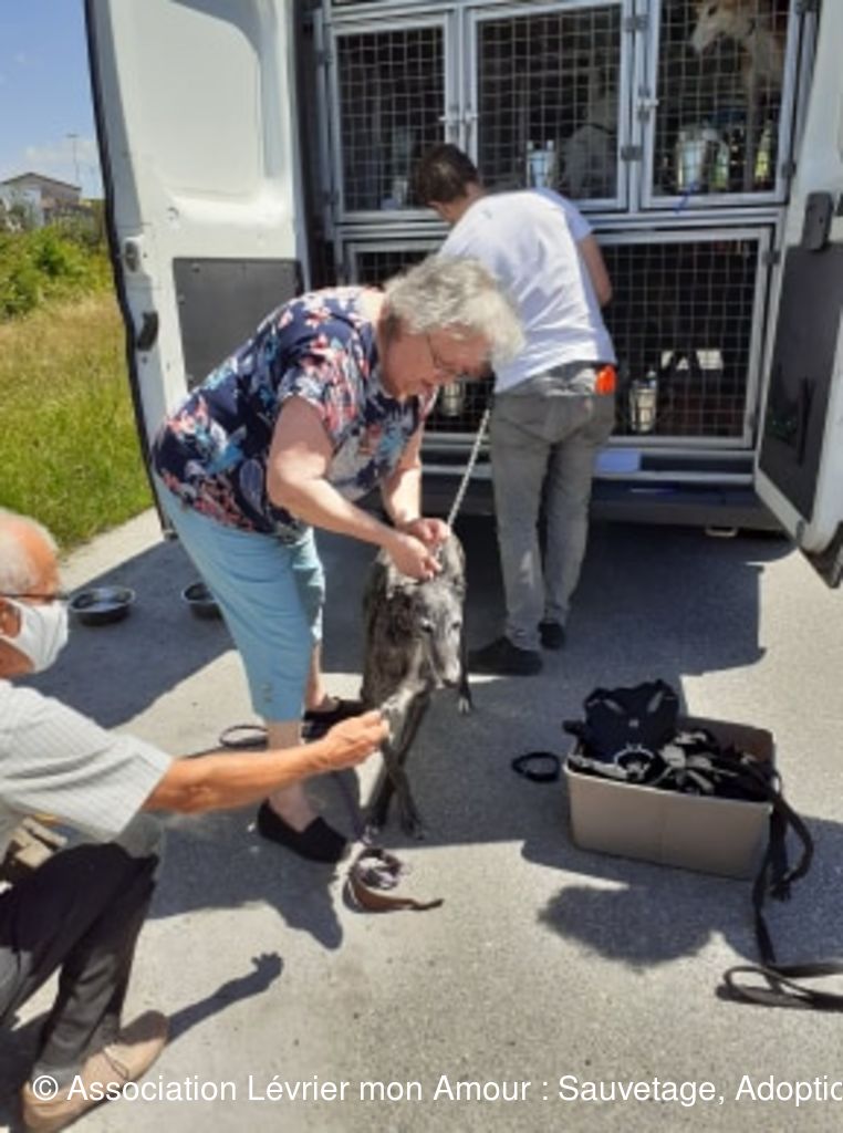 Et un par un, ils sont descendus, doucement la route a été longue –  ils sont tous sécurisés et équipés de la précieuse médaille Lévrier Mon AMOUR, certitude d’une vie meilleure mais vite il faut se dégourdir les pattes - avec crainte ils foulent pour la première le sol français.