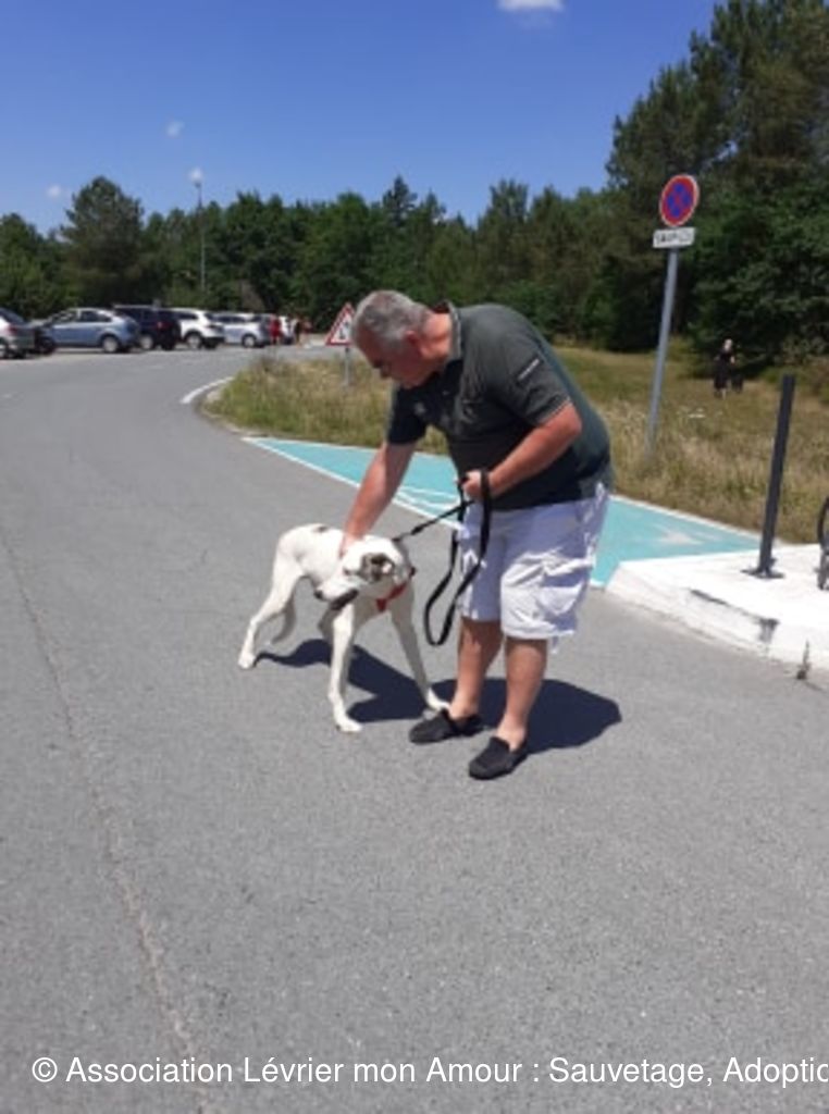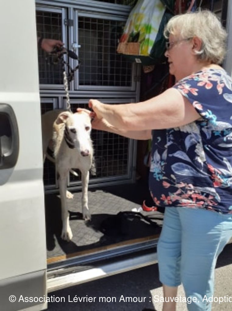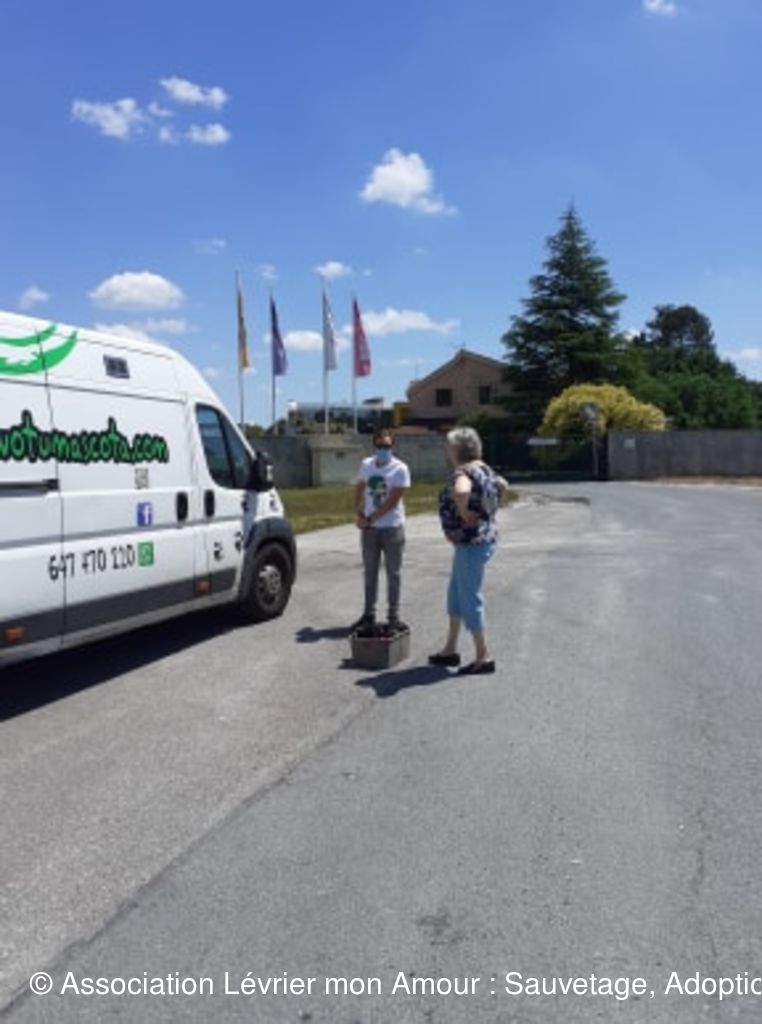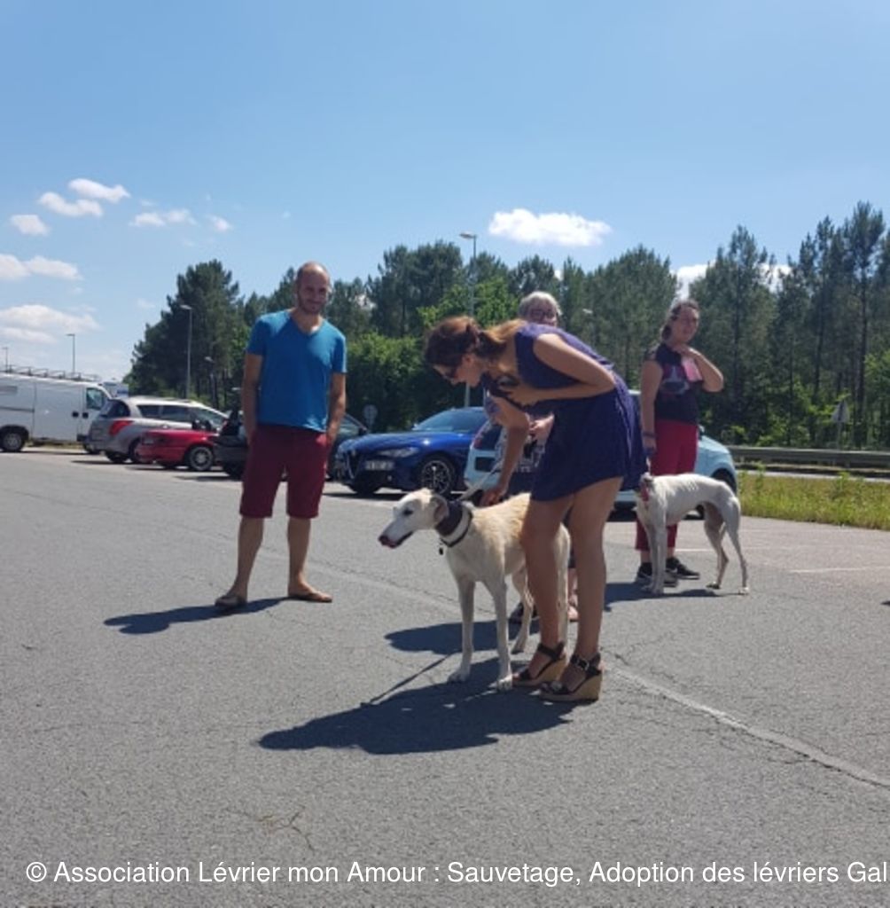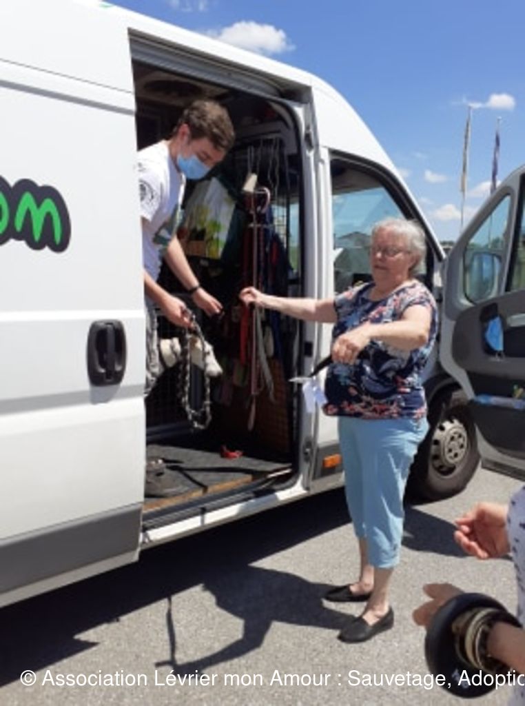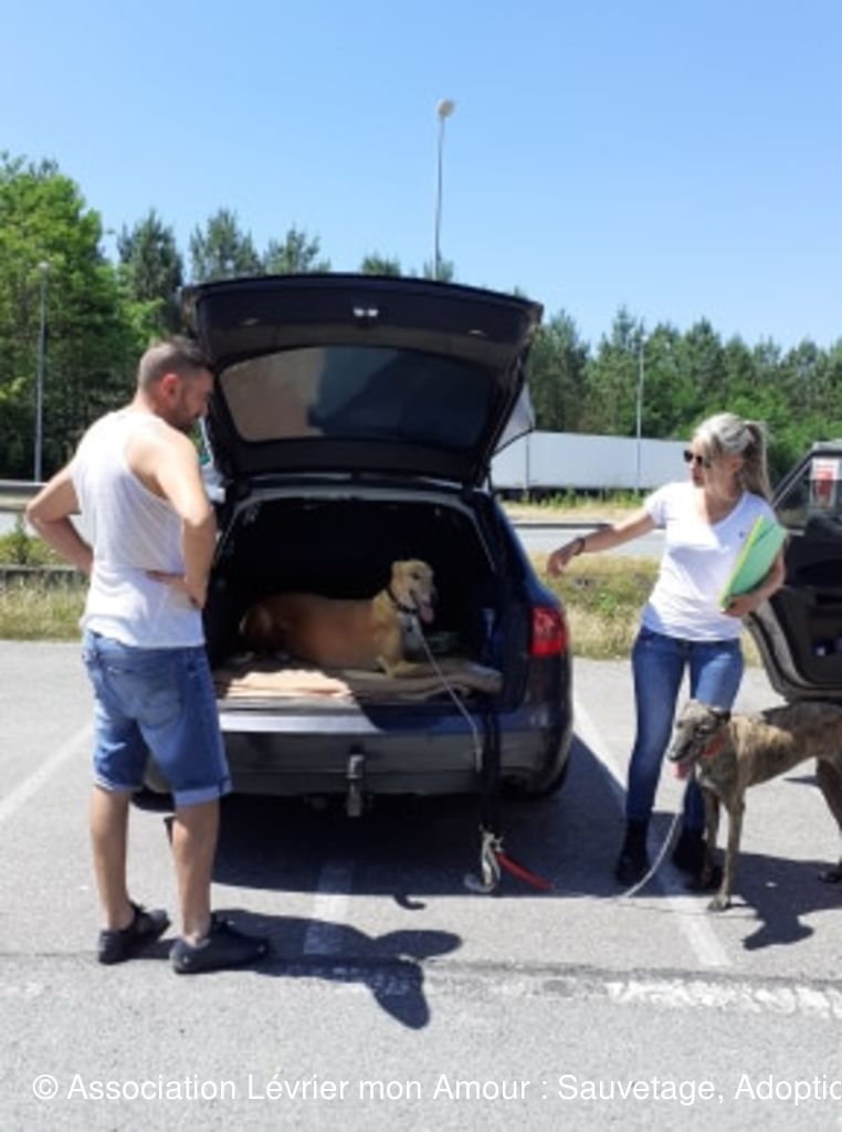 Et un par un, ils sont descendus, doucement la route a été longue –  ils sont tous sécurisés et équipés de la précieuse médaille Lévrier Mon AMOUR, certitude d’une vie meilleure mais vite il faut se dégourdir les pattes - avec crainte ils foulent pour la première le sol français.