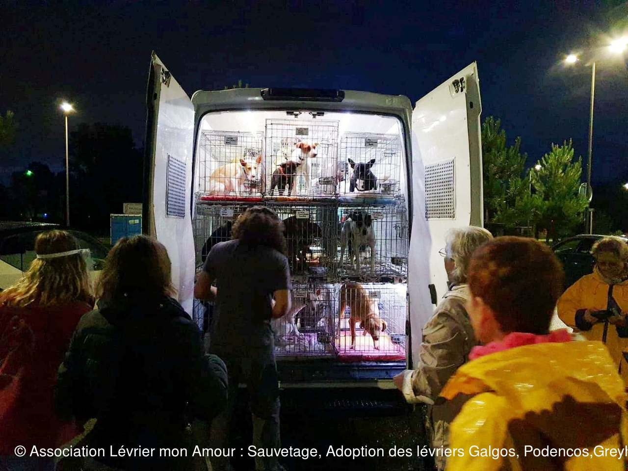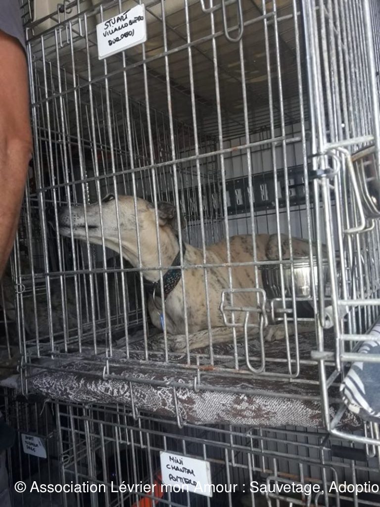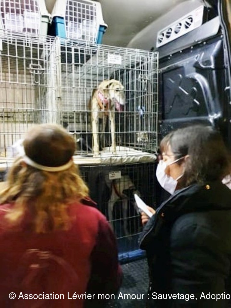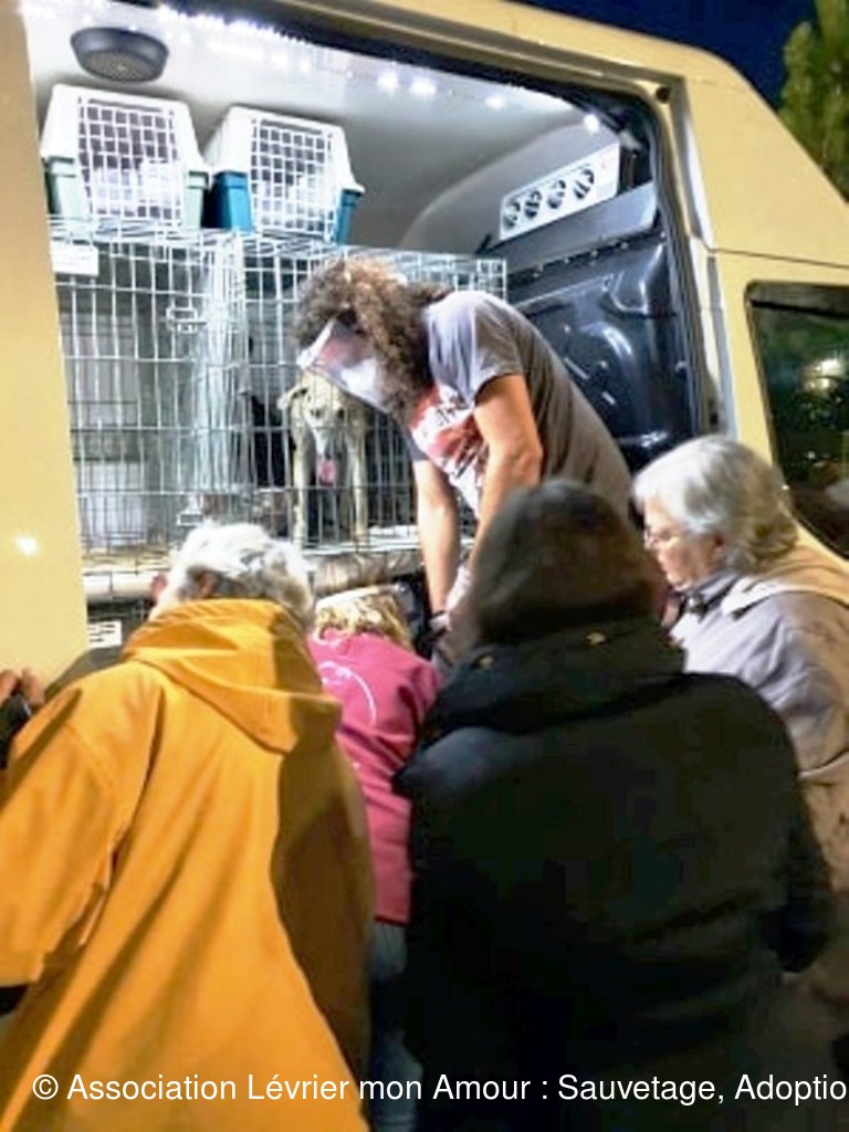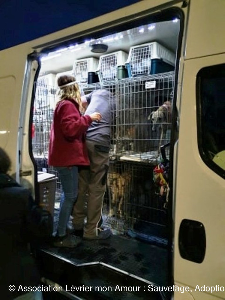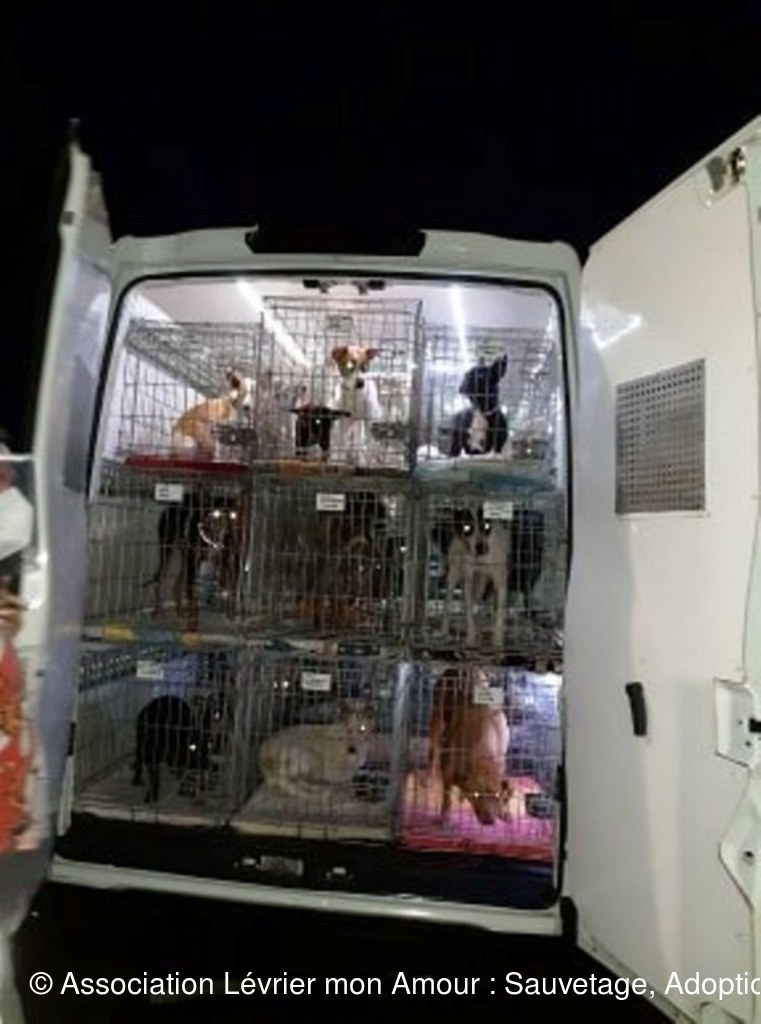 Le camion est rempli de cage, des lévriers, mais également d’autres chiens, des petits, des grands, car ce transport concerne également d’autres associations ; d’ailleurs pour certains la route continue direction Paris et l’Allemagne.