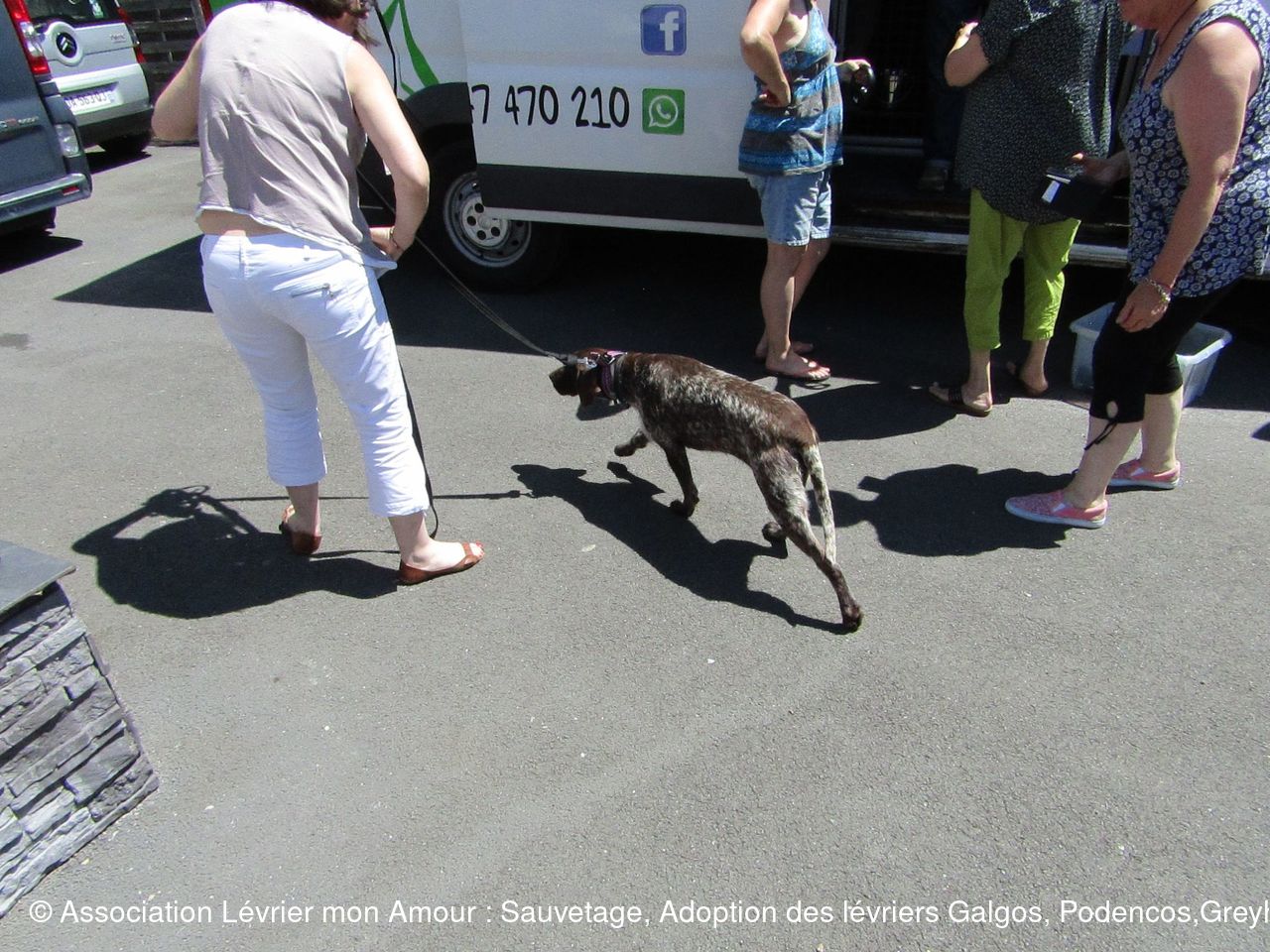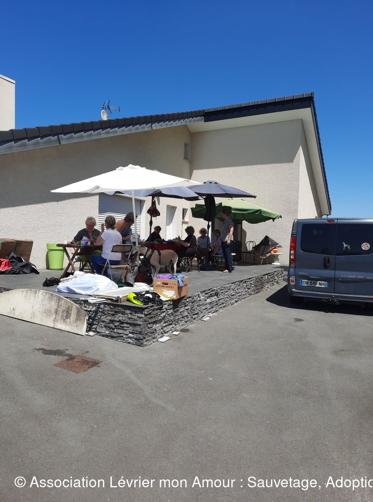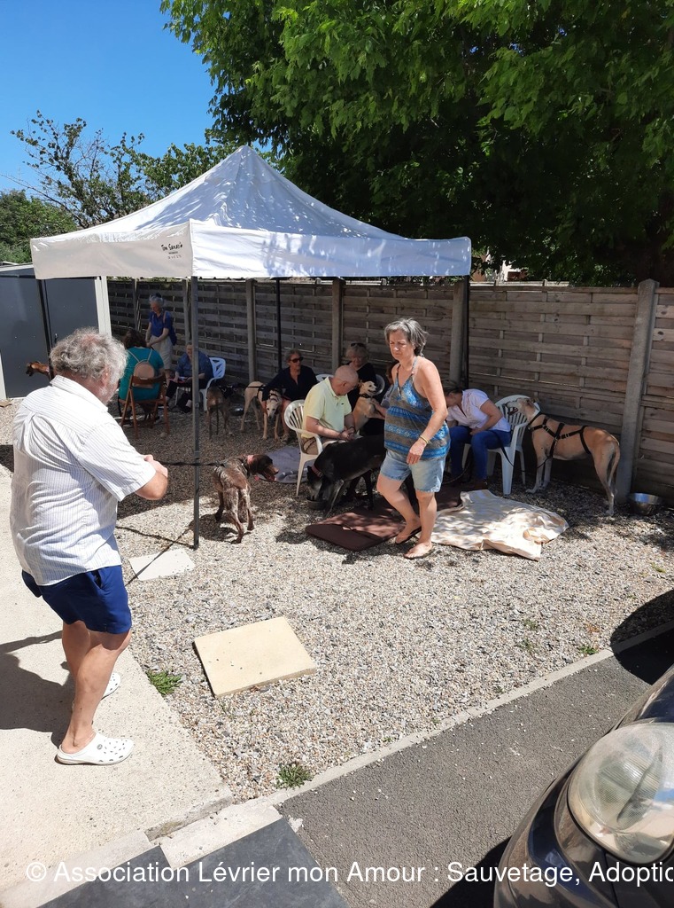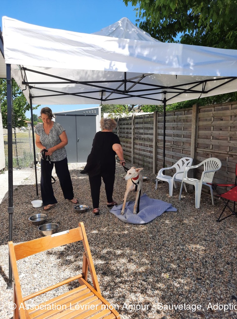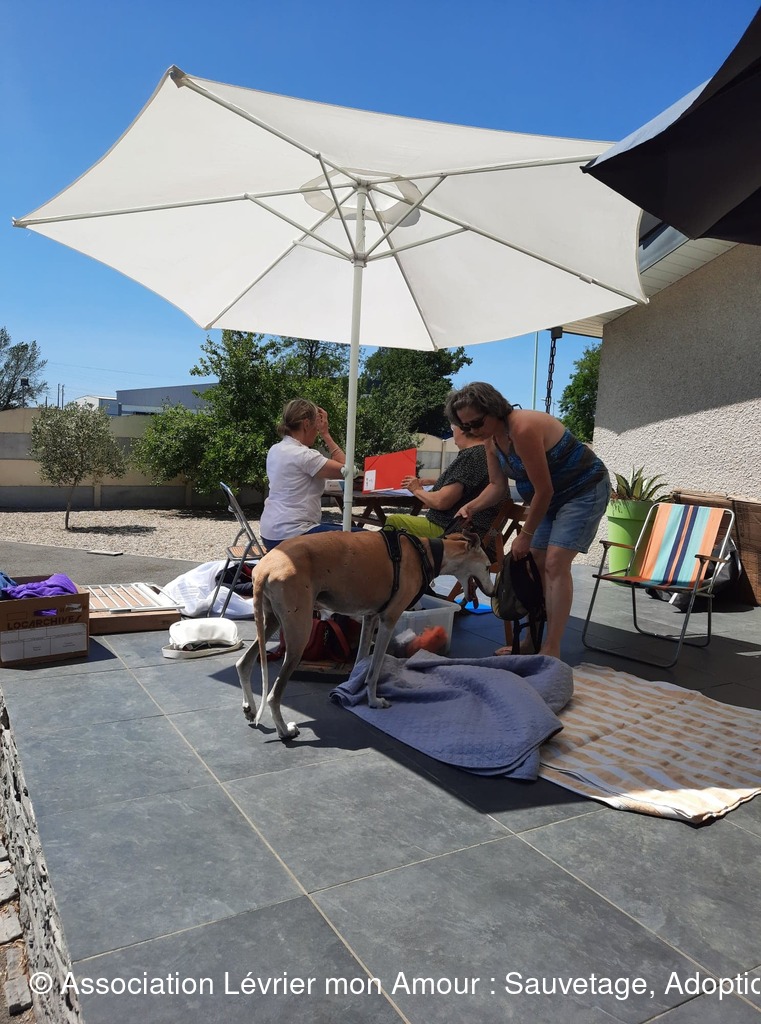 Nous attendons dans une chaleur torride ce magnifique sauvetage avec une très grande impatience ; une partie de l’équipe LMA, les adoptants et famille d’accueil sont présents. Heureusement nous avons installé des parasols et un barnum pour faire de l’ombre aux 2 et 4 pattes. La joie et la bonne humeur sont au rendez-vous.