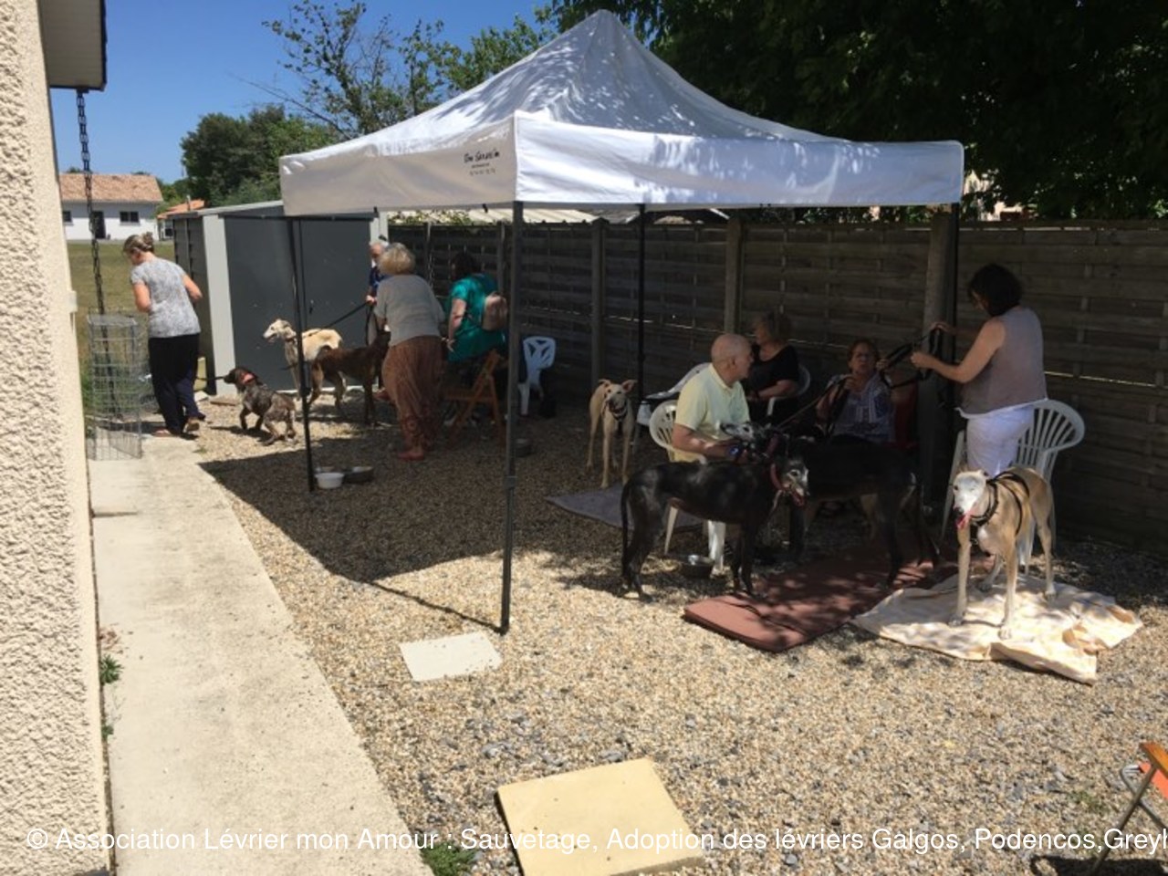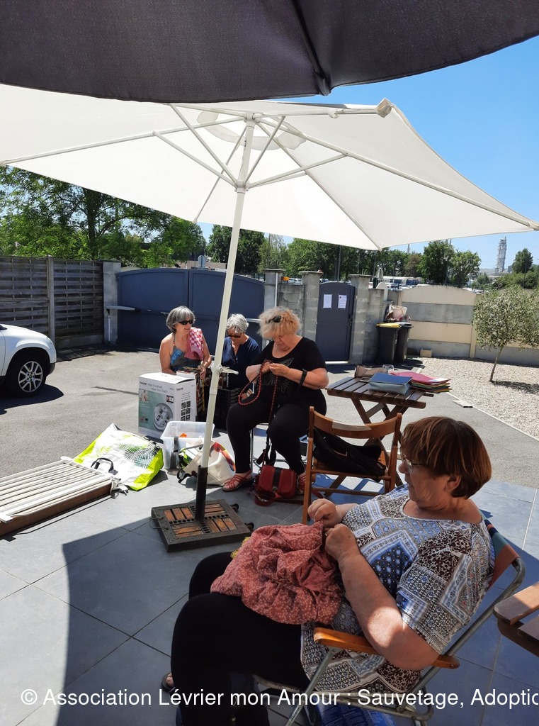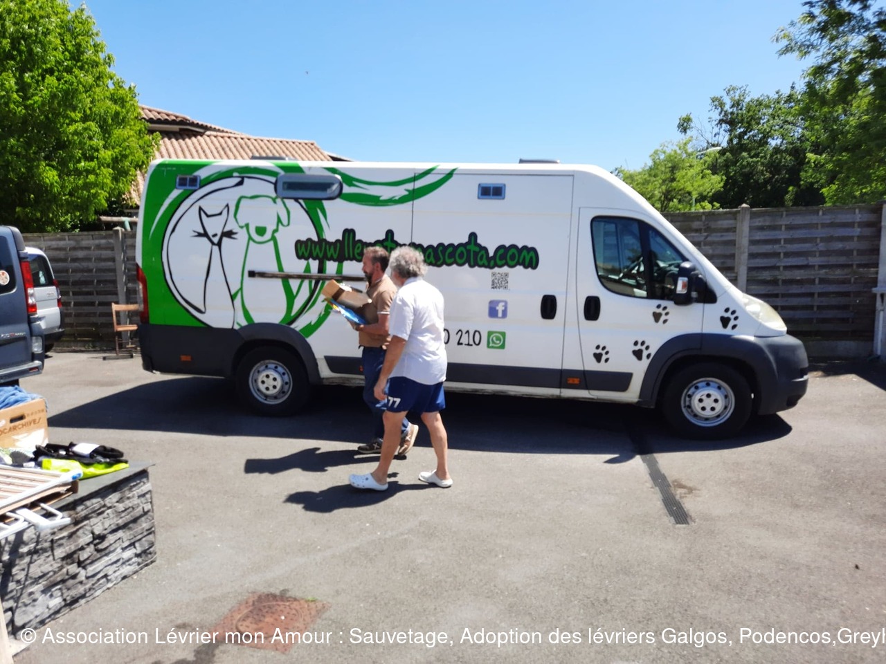 Nous attendons dans une chaleur torride ce magnifique sauvetage avec une très grande impatience ; une partie de l’équipe LMA, les adoptants et famille d’accueil sont présents. Heureusement nous avons installé des parasols et un barnum pour faire de l’ombre aux 2 et 4 pattes. La joie et la bonne humeur sont au rendez-vous.