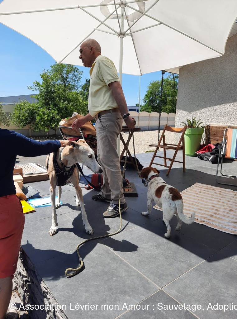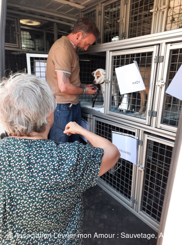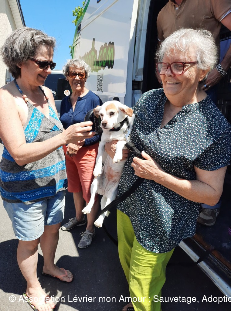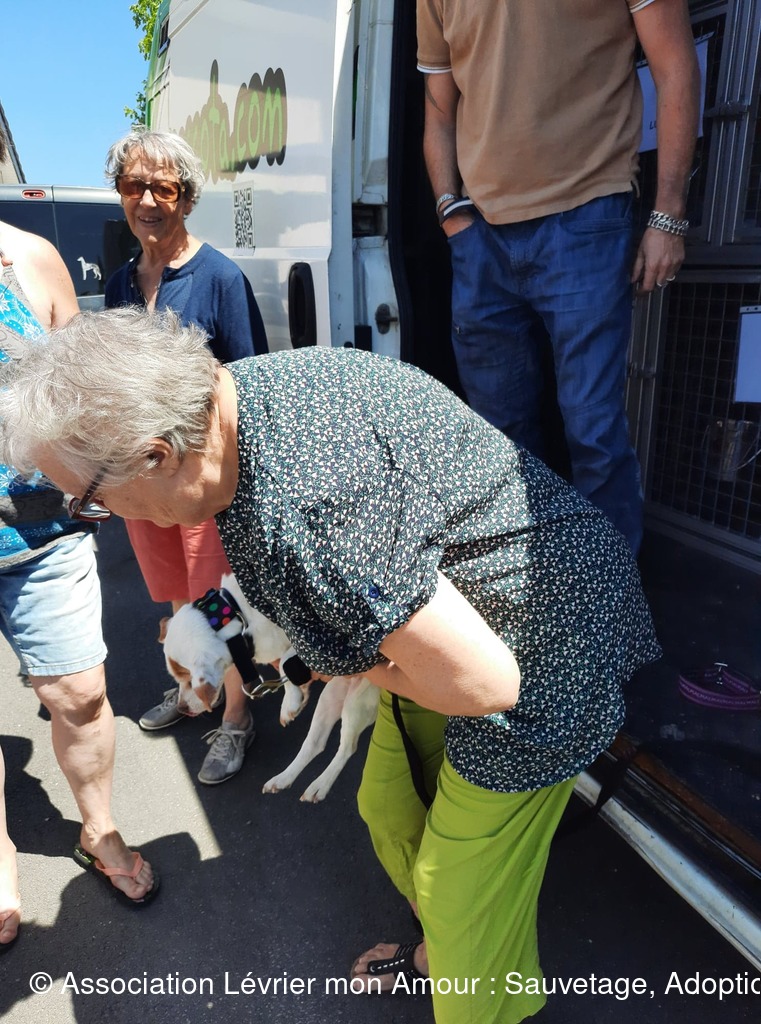 Nous prenons notre temps pour mettre à chaque loulou leur collier et leur harnais sécurisé ; les conversations autour de nos petits protégés vont bon train et pour certains « anciens » adoptants comme Michèle ( qui prend Calvario en accueil) ainsi que Marie-Francoise et Antoine (qui adoptent ensemble Sindy, Tango, Luna et Chico pour le grand bonheur de leur papy Odin) ce sont des supers et joyeuses retrouvailles. Sans oublier Jane et Geofroy pour l’adoption double de Blanco et Jaimito qui ont le bonheur de rester ensemble. Nous n'oublions pas petite crevette podenquita Hada, ni Roma et Luz qui sont très attendues dans leur famille. Merci Catherine notre Gerçoise pour l’adoption de Linda, et tous les adoptants de notre belle asso LMA.